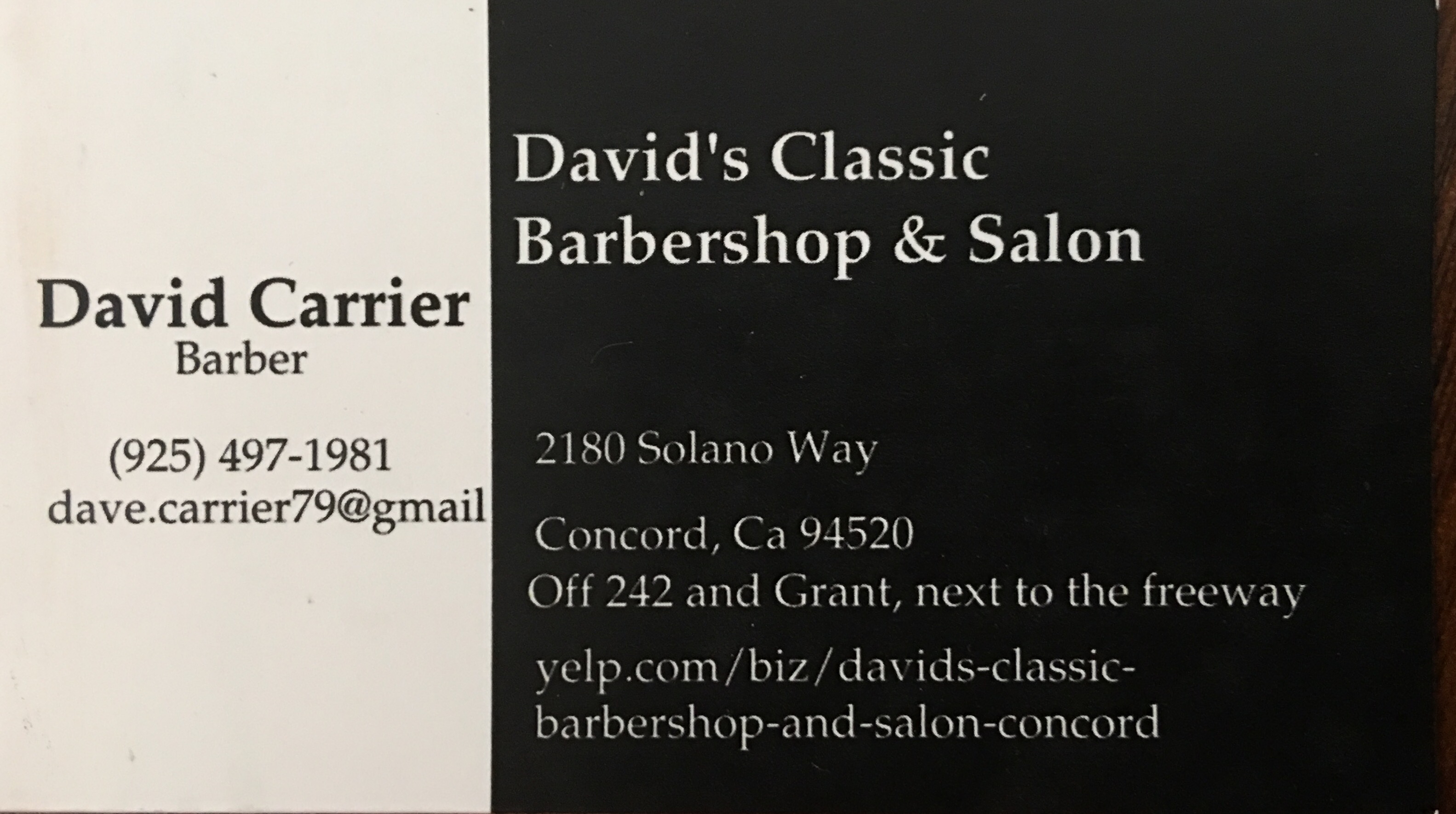 | David's Classic Barbershop and Salon 2180 Solano Way Concord, California 94520 925-497-1981 https://www.facebook.com/Davids-Classic-Barbershop-and-salon-1539397589667953/ | Barbershop and Salon Regular Price: $Varies by Service Sale Price: $ Barbershop and Salon Category: Services |